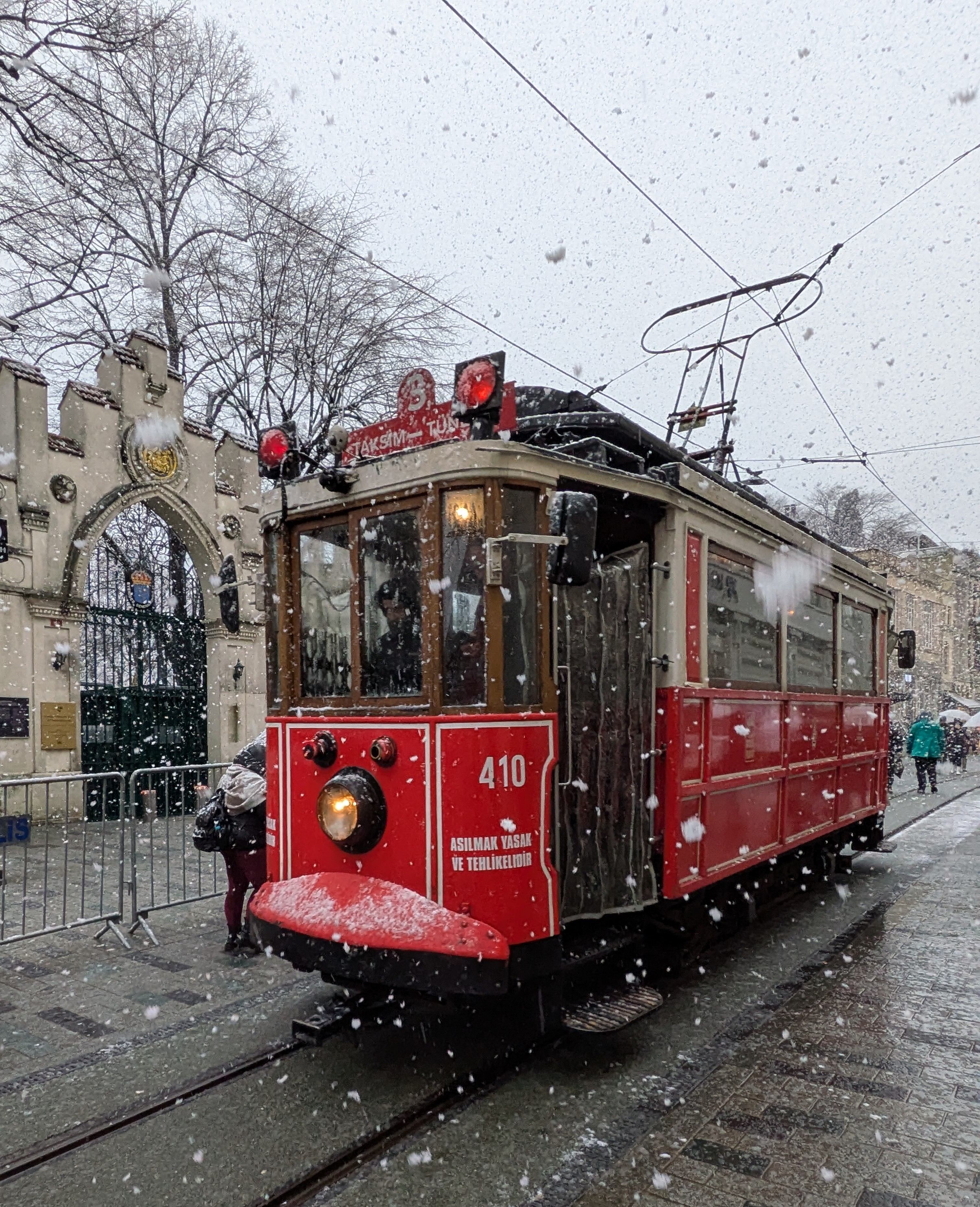 Below, the Galata Tower and a heritage tram on İstiklal Caddesi.