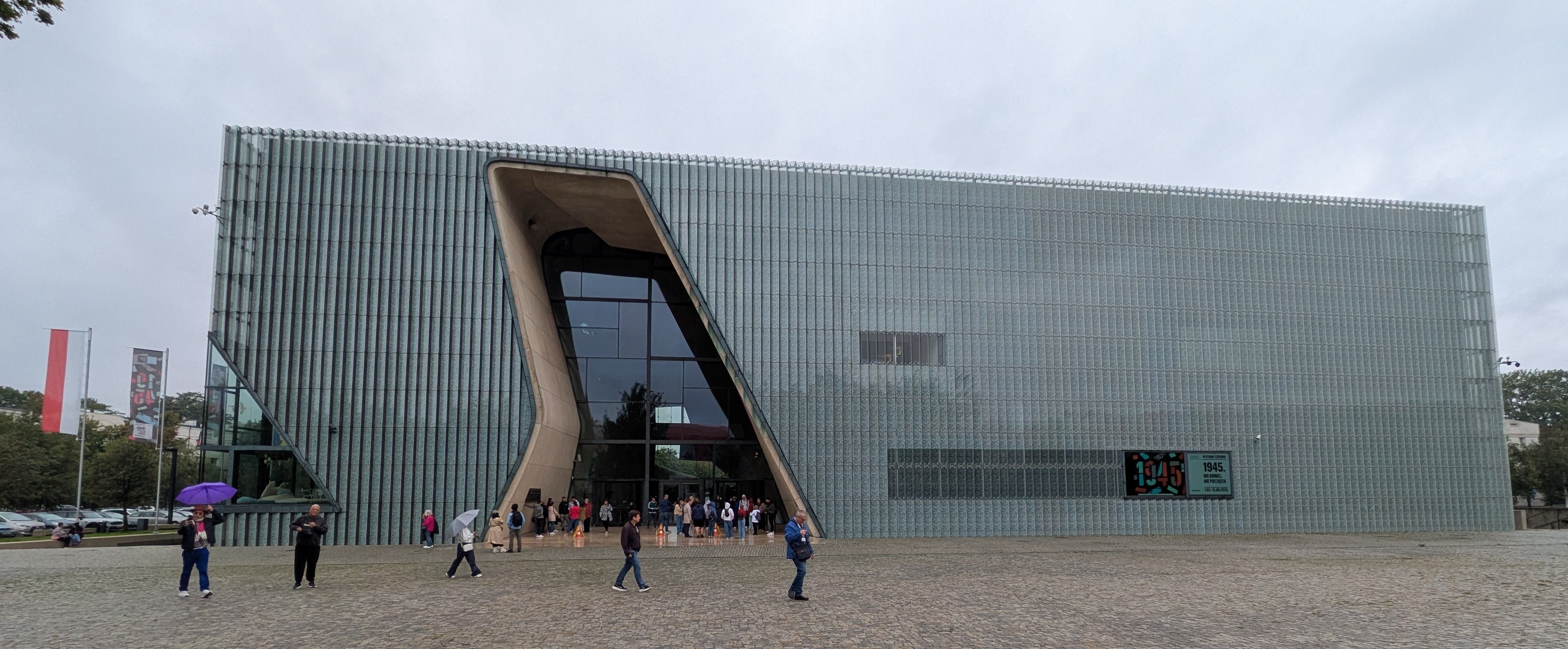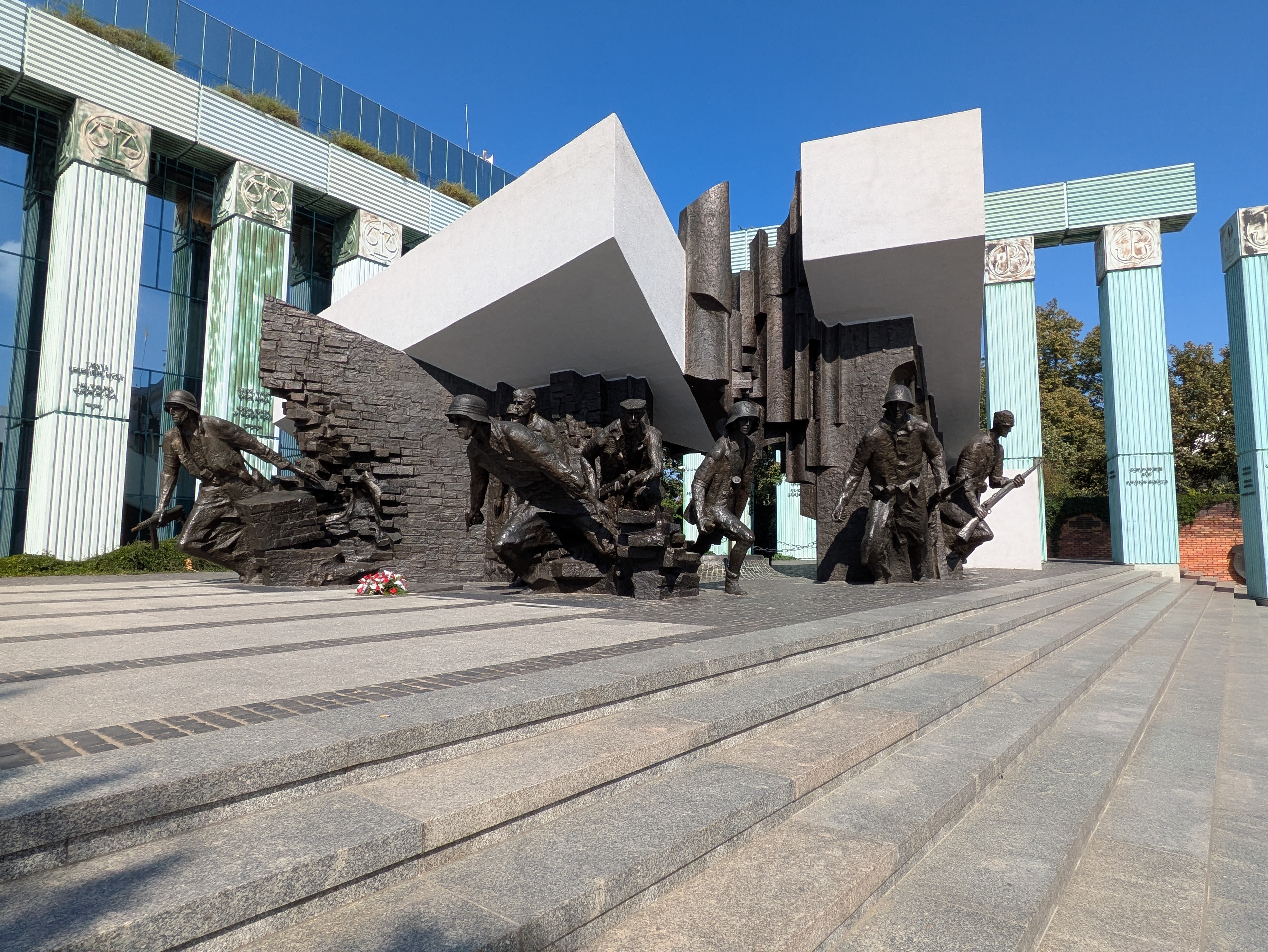 (Above: the bullet-riddled Ghetto wall sitting directly below new-build apartments; the Warsaw Uprising monument; POLIN exterior and interior)