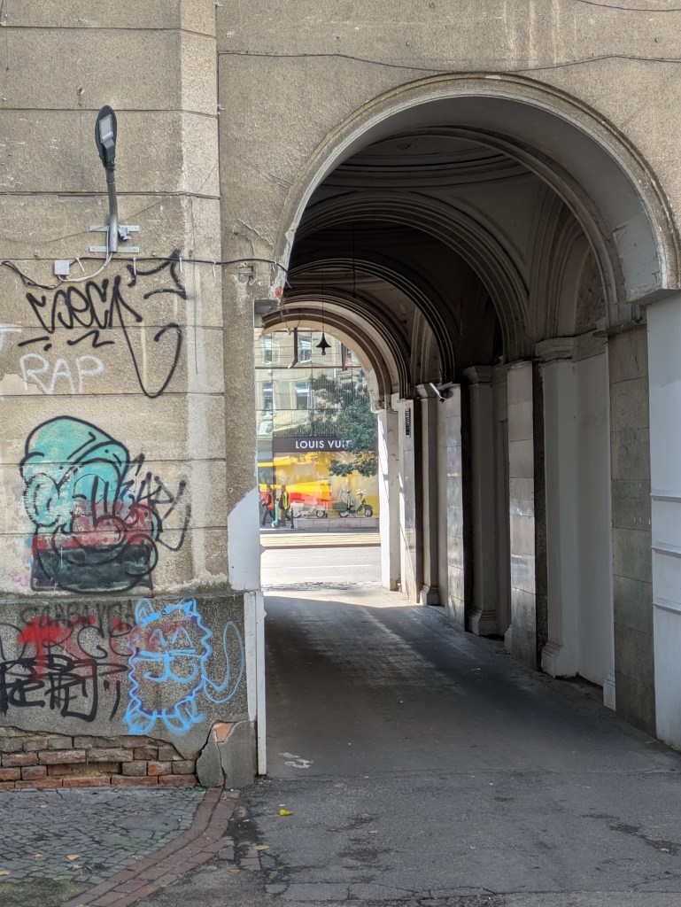 Turning south off the lively restaurant-lined pedestrianised strip of Chmielna towards Jerozolimskie, I’m confronted with an analogy for Warsaw today: a view through the archway of an ugly, graffiti-riddled old communist block to a gleaming new Louis Vuitton store. Left through the archway, and I walk past one of the few remaining traditional ‘bar mleczny’ (milk bar), all austere wood-paneling, with a queue of Varsovians waiting to collect their breakfast from the serving hatch, whilst BWMs glide past outside.