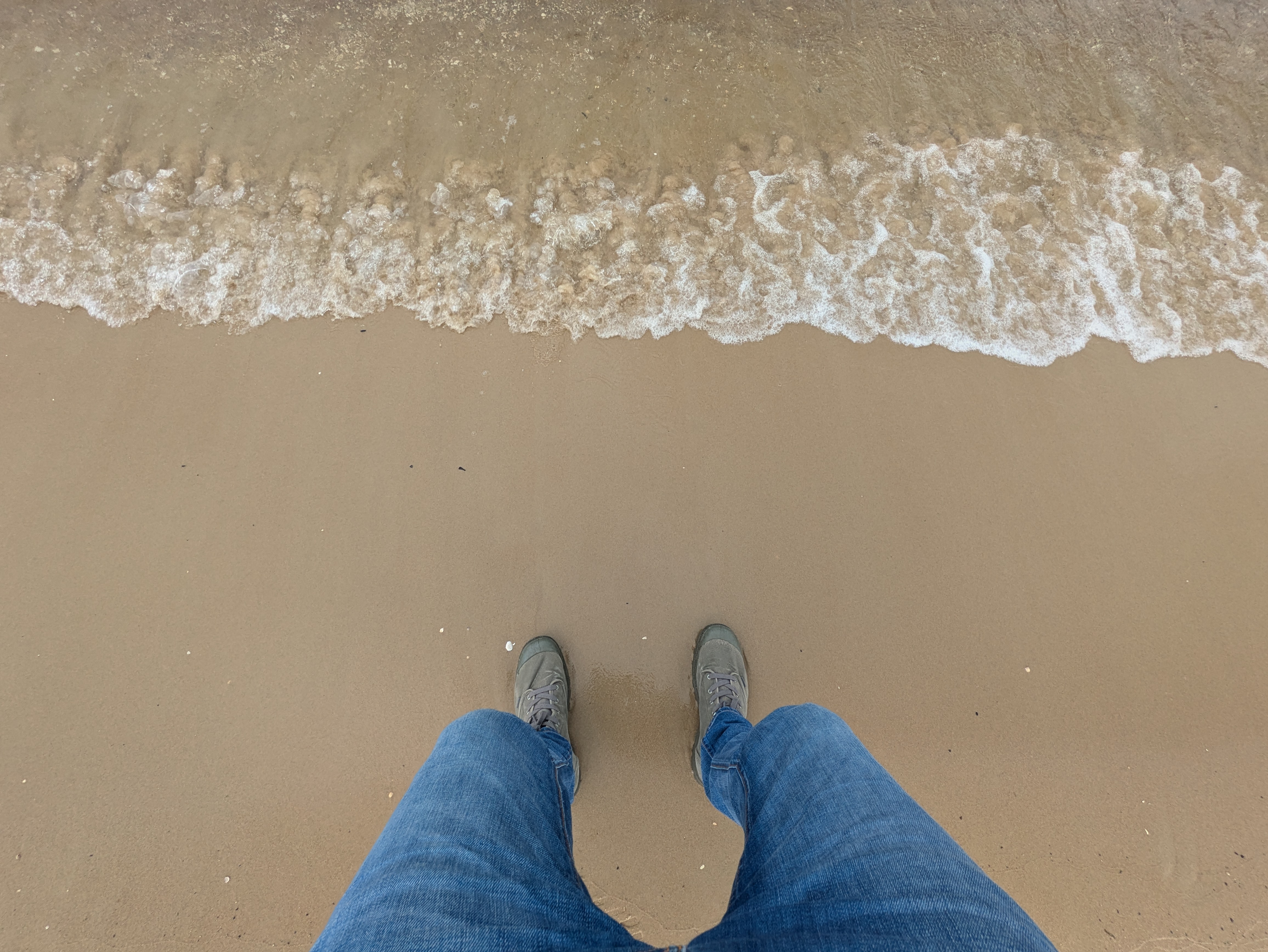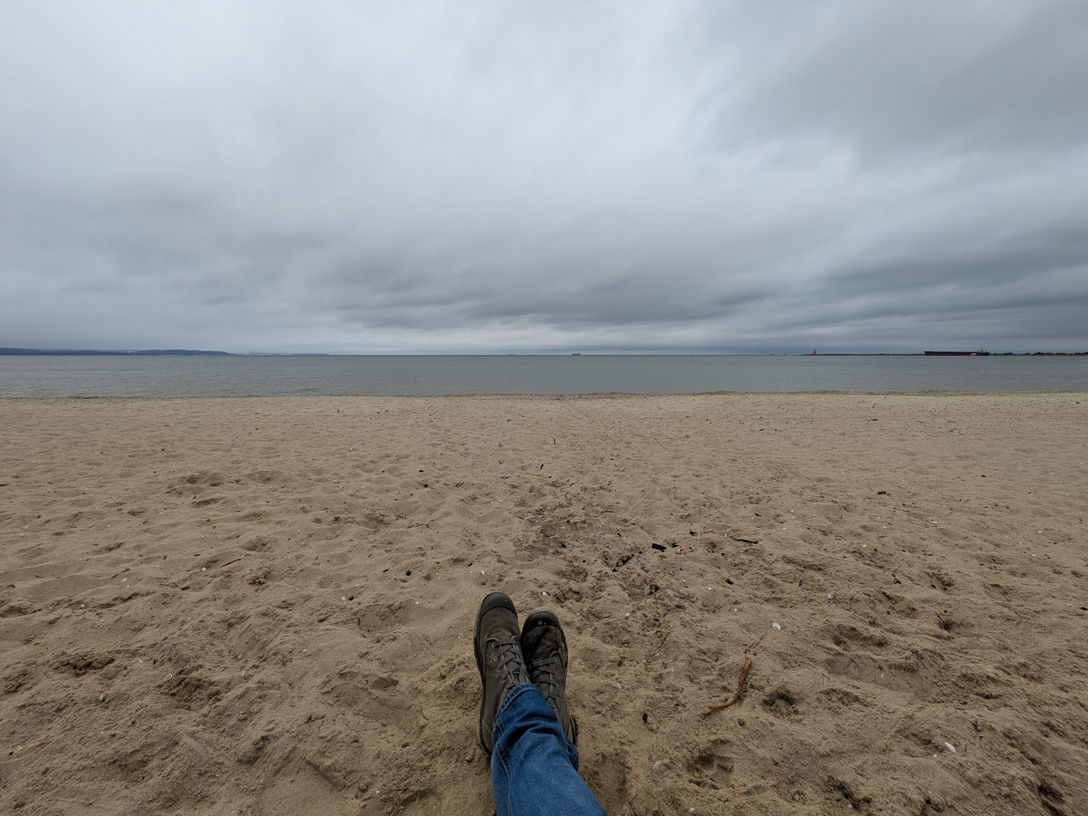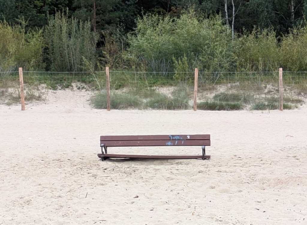 Arriving at the Brzeźno end of the beach, I find a bench that has sunk so deep that, taking a seat, my arse is just 2″ above the fine sand. That pine scent has been replaced by the familiar smell of the sea. Young seagulls land next to me, stoney grey wings matching the colour of the horizon. Rather apologetically, they begin exploring their arena, pausing and tilting their heads as if listening to the conversation of passing dog walkers.